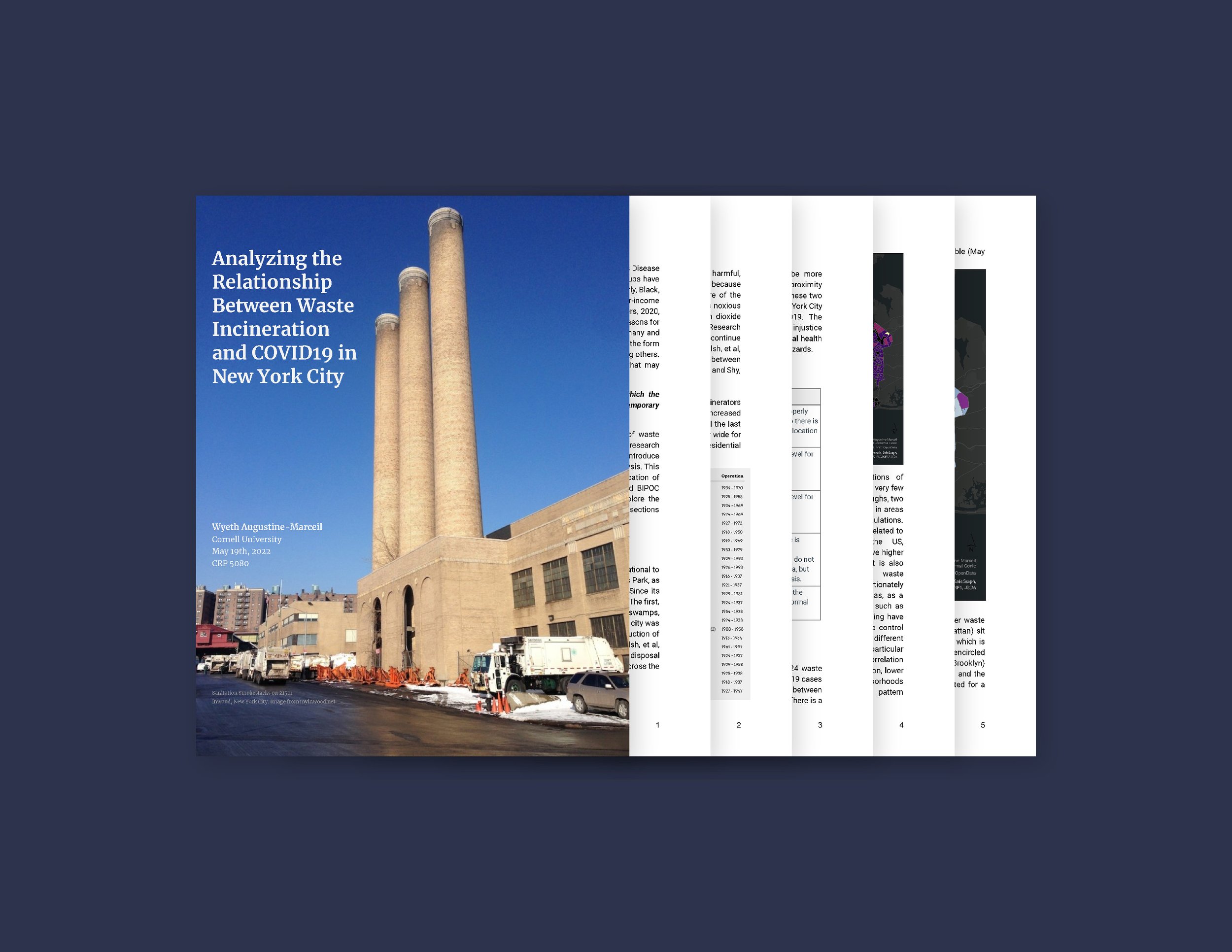 Incineration was once the most common form of waste disposal in New York City. Waste incineration has been associated with higher rates of respiratory illness. During a semester-long class, I utilized GIS to analyze the relationship between the locations of waste incinerators and incidence and outcomes of Covid in New York City.
